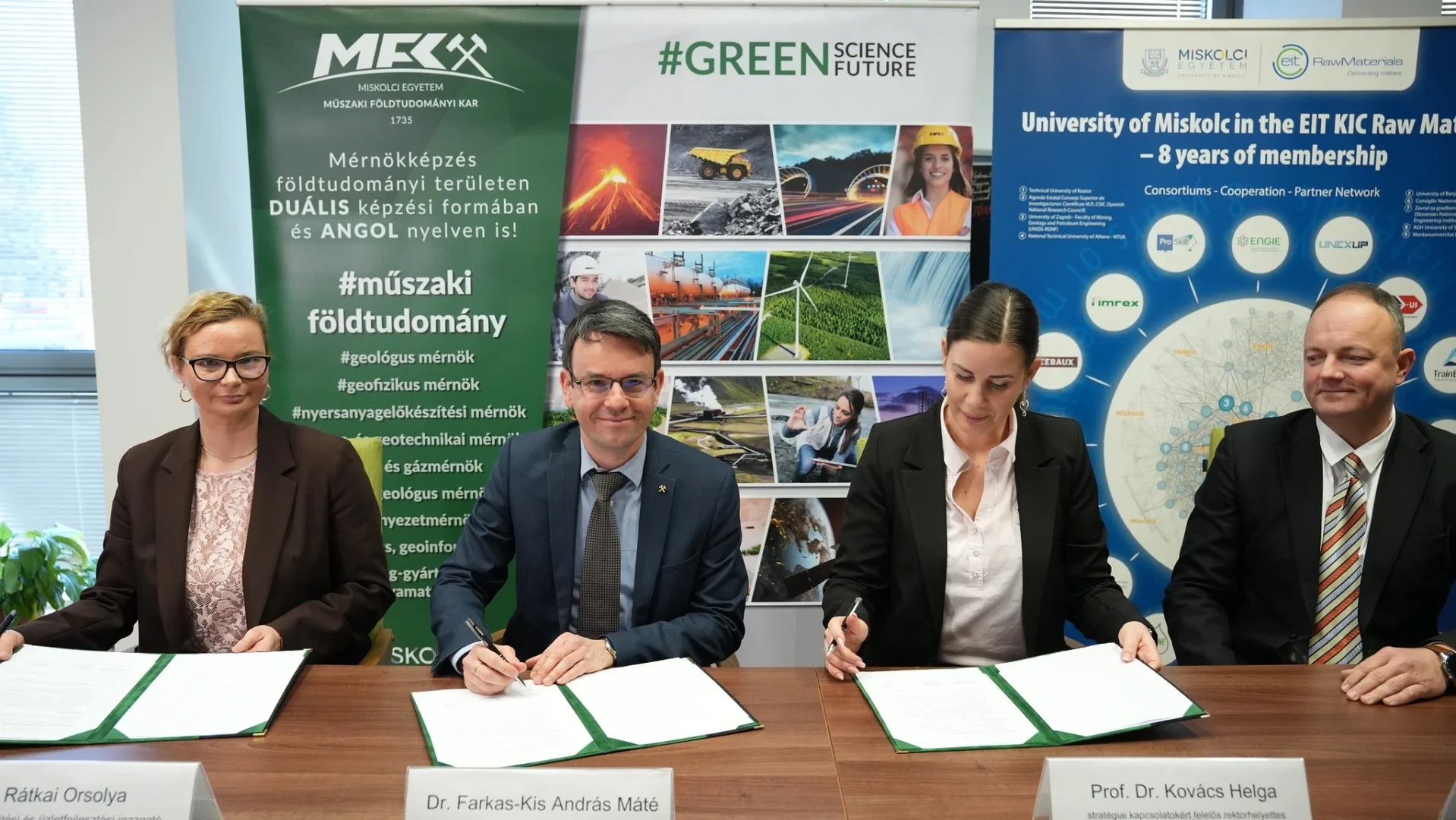 Kép: Az együttműködés aláírói: Rátkai Orsolya értékesítési és üzletfejlesztési igazgató és dr. Farkas-Kis András Máté (Mecsekérc Zrt.), prof. dr. Kovács Helga stratégiai kapcsolatokért felelős rektorhelyettese és prof. dr. Mucsi Gábor dékán (Miskolci Egyetem)